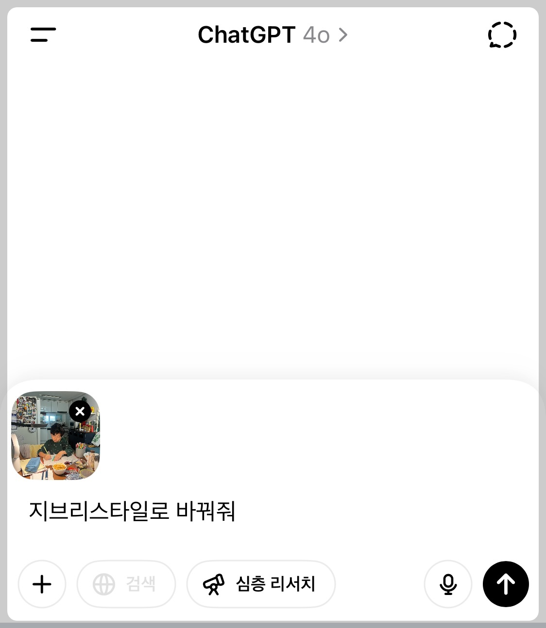 💡 사진이 올라오면 "지브리 스타일로 바꿔줘" 라고 간단하게 적어주고 하단 오른쪽 끝 검정 화살표를 눌러요