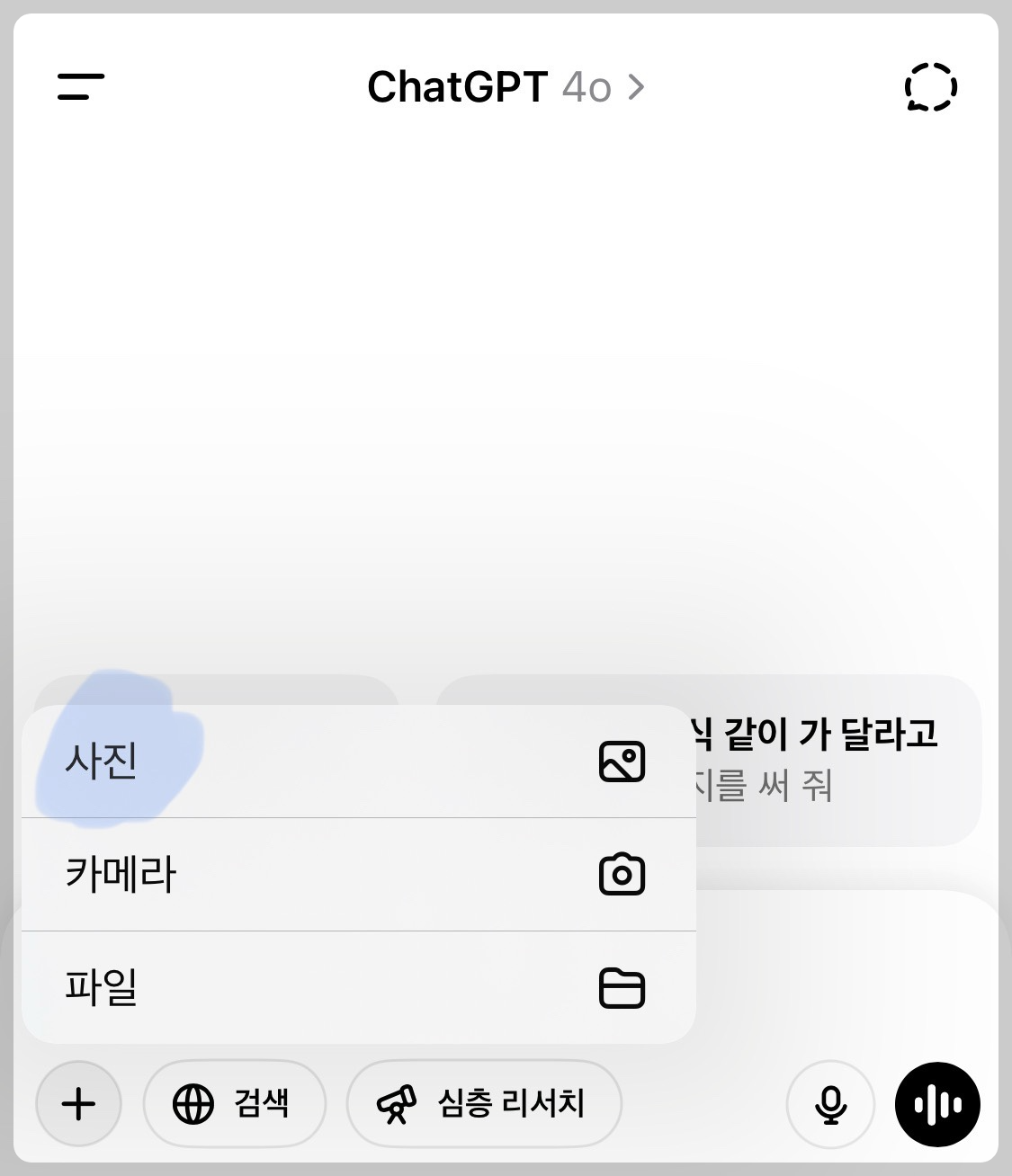 - 챗지피티 앱을 열고, 변환하고 싶은 이미지를 스크린샷 또는 갤러리에 저장해 주세요.